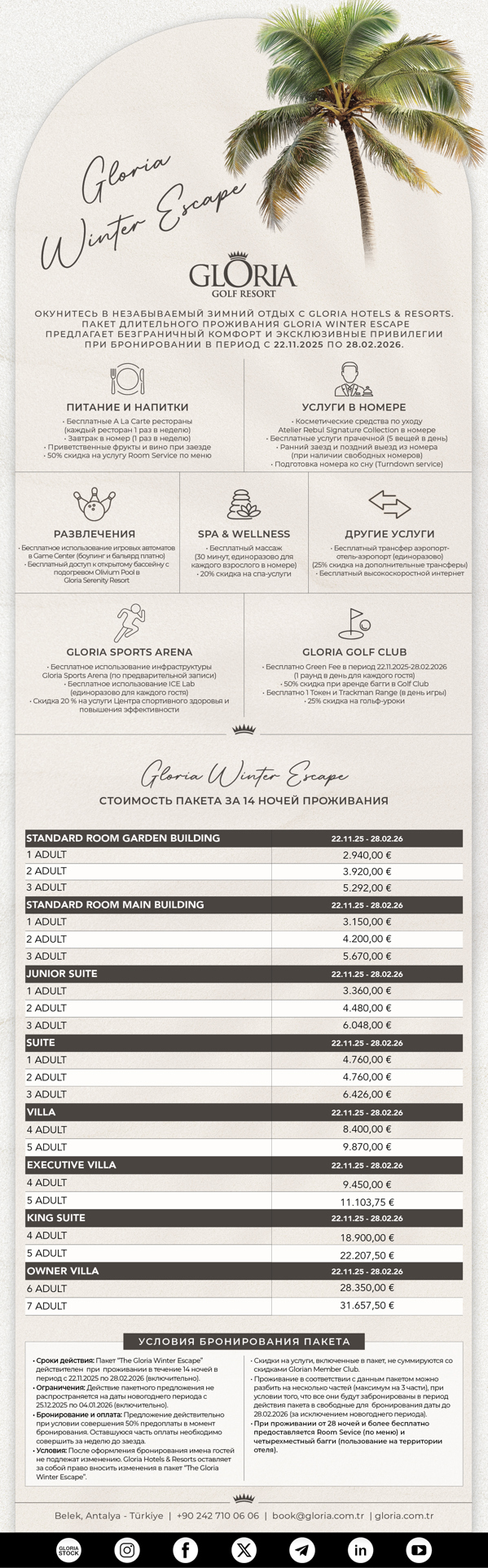С 22 ноября 2025 года по 28 февраля 2026 года насладитесь роскошью, покоем и привилегиями с эксклюзивным пакетом Winter Escape в Gloria Golf Resort.